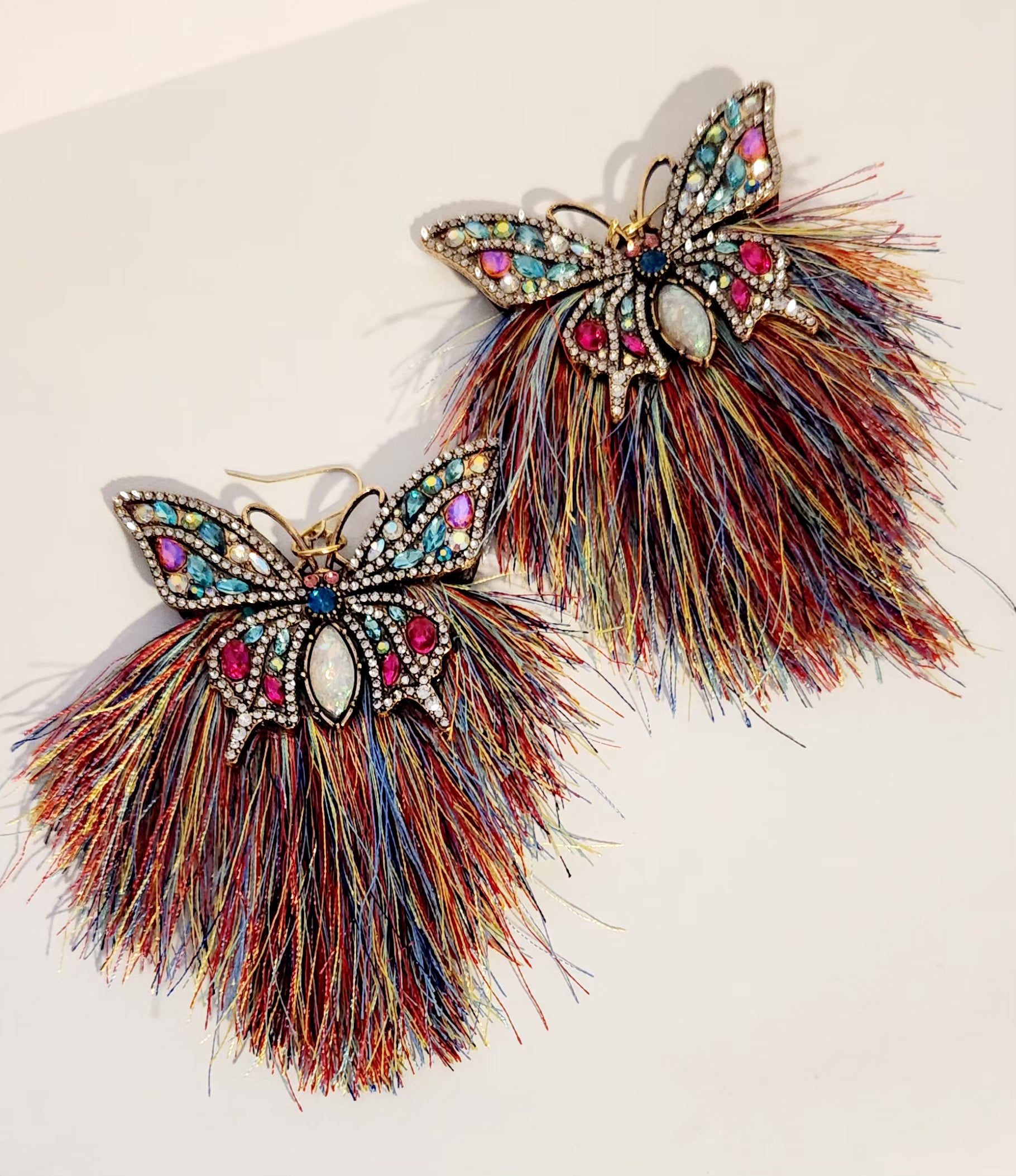 Multi_colored silk tassel, rhinestone butterfly tassel with leather backing